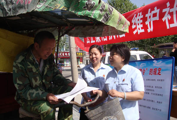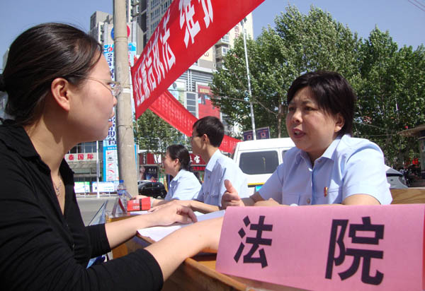 5月11日,法官在给群众发放宣传资料解答公正廉洁执法的主要内容。在深入推进三项重点工作中,河南省沁阳市人民法院把5月份作为三项重点工作的宣传月,通过制作版面、悬挂标语、设立咨询台、发放宣传资料等多种形式提高群众的知晓率,受到了广大群众的欢迎。