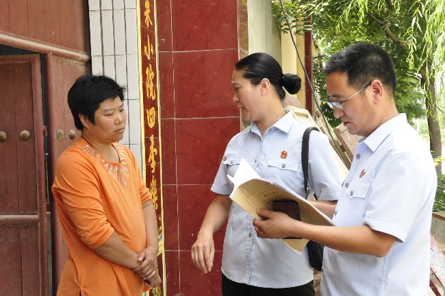 9月4日中午,沁阳市人民法院执行局出动辆警车,执法人员20余人,来到柏香镇肖寺村对长期躲避法院执行、拒不履行法定判决义务的3名被执行人的家庭住所依法采取了搜查、拘留等强制执行措施。图为,法官在被执行人家门口做其思想工作让其尽快履行法律义务。